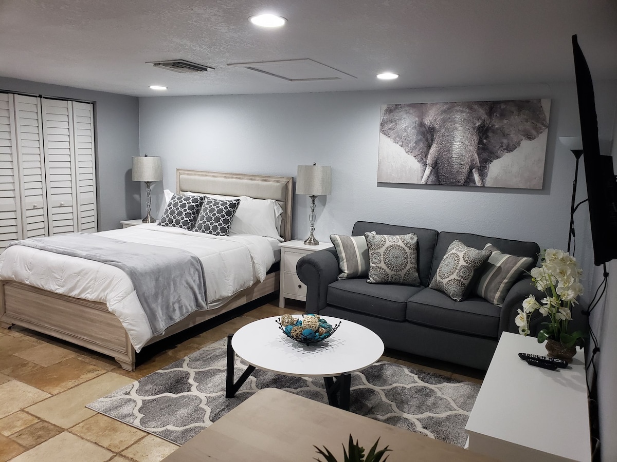 Suite studio élégante et privée récemment rénovée avec lit Queen Size, salle de bain, coin salon/salle à manger/espace de travail, kitchenette (sèche) et buanderie commune dans le quartier branché d'Old Seminole Heights. Avec un score de marche de 83/100, il est facile de visiter les bars, restaurants, cafés, boulangeries et boutiques pittoresques, ou de flâner dans les rues bordées d'arbres de maisons de plus de 100 ans. Cet endroit est parfait pour l'explorateur de Tampa avec un accès facile au centre-ville. Stationnement gratuit dans la rue, connexion Wi-Fi gratuite, buanderie commune gratuite (dans l'espace adjacent).