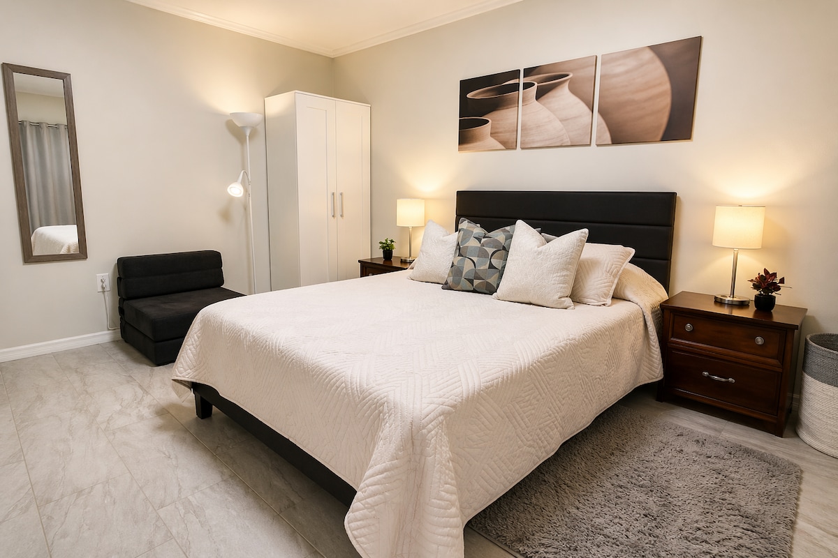 Spacious private suite for up to 4 guests, thoughtfully designed for comfort, cleanliness, and relaxation. Enjoy ultra-fast Wi-Fi (1 Gig), ideal for remote work, streaming, and business travelers. Set in a quiet neighborhood with easy access to downtown Tampa and top attractions—perfect for unwinding after a busy day. 🚗 Free on-site private parking 💻 High-speed Wi-Fi (1 Gbps ideal for remote work) 📺 Smart TV 🌿 Private deck to relax outdoors ☕ Coffee station included