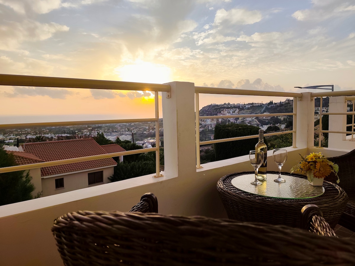 Entrez dans la sérénité ! Évadez-vous dans une cachette ensoleillée sur une colline tranquille. Détendez-vous près de la piscine, profitez du soleil et profitez d'une vue imprenable sur la mer et de couchers de soleil dorés. À seulement 15 minutes en voiture de Paphos, nos deux charmants studios sont le point de départ idéal pour explorer. Les plages, les sentiers naturels, le port, le lagon bleu et la vieille ville de Paphos sont tous à 15-30 min. en voiture. Wi-Fi gratuit, parking, une place de village avec des tavernes et un bar à vin, à seulement 4 minutes en voiture. La voiture est indispensable. Piscine ouverte toute l'année (non chauffée).