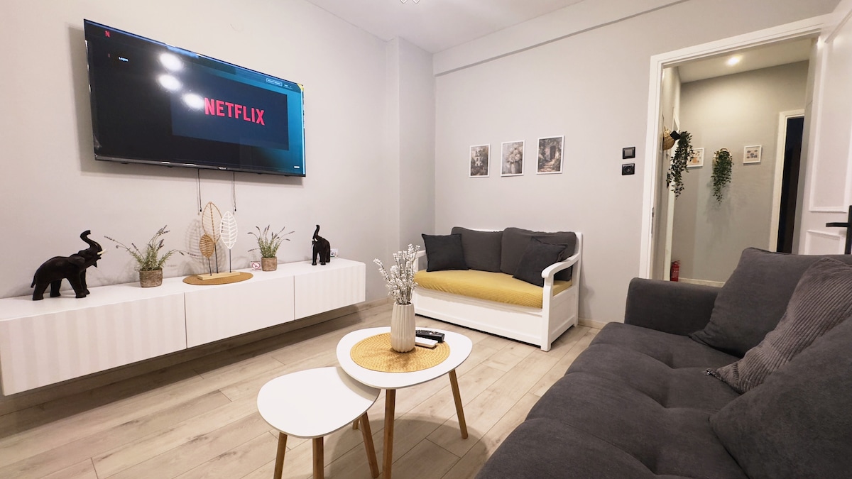Cet appartement unique est situé au dernier étage d'un nouvel immeuble avec une vue imprenable sur Thessalonique et comprend une place de parking gratuite. L'appartement est situé au 6e étage et les voyageurs y ont accès en utilisant l'ascenseur. La distance du centre-ville est d'environ 4 km. La distance de l'aéroport est de 15 km. • Les équipements comprennent notamment : 2 téléviseurs intelligents (accès à Netflix, Disney+, etc., en utilisant votre propre compte) • Machine à café Nespresso. • Lave-vaisselle, lave-linge et sèche-linge. • Place de stationnement gratuite dans l'immeuble.
