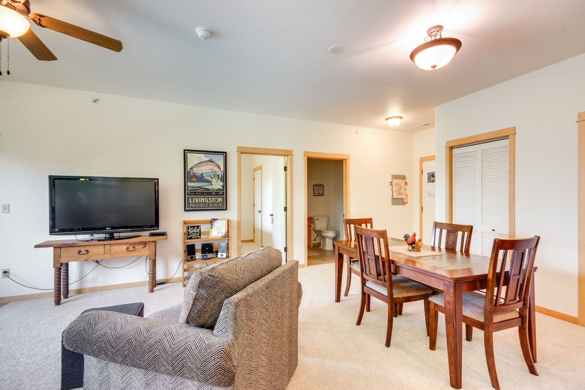 Ce camp de base abordable est votre destination pour vos vacances touristiques et actives dans le sud-ouest du Montana. Nous sommes idéalement situés à 10 minutes au nord du parc national de Yellowstone, juste à côté de l'autoroute 89 et directement sur la rivière Yellowstone. Condos récemment rénovés de 2 chambres/1 salle de bain. Cuisine entièrement approvisionnée, serviettes et draps neufs, coin salon confortable avec télévision, Wi-Fi et climatisation ! À 5 minutes des sources chaudes de Yellowstone, à 25 minutes du spa de jour de Chico Hot Springs et à un mile du ranch OTO.