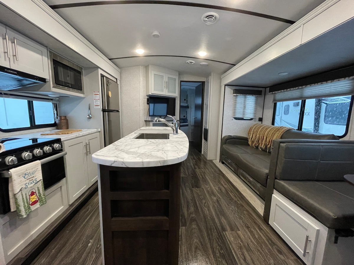 Ce camping-car est plus confortable pour 2 adultes et 2 enfants, car 2 lits sont des lits superposés, 32" x 70". La table se transforme en lit presque complet, idéal pour 1 adulte et il y a un lit Queen Size très confortable avec une porte d'intimité. Toutes les commodités sont là, sauf un lave-linge/sèche-linge. Il y a une cuisinière à gaz et un four, un barbecue au propane, un réfrigérateur-congélateur, le chauffage et la climatisation, une télévision avec Amazon Firestick et des DVD, une table, des chaises, des rockers et des rôtissoires pour se détendre autour du feu de camp. De belles vues, des couchers de soleil, la faune et les oiseaux vous attendent !