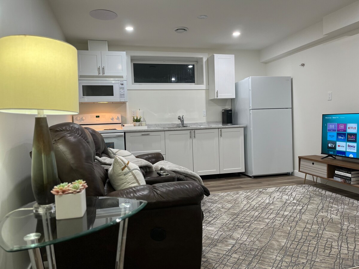 Une nouvelle suite au sous-sol. Confortable, paisible et un endroit qui vous fait vous sentir comme chez vous, loin de chez vous. Il est équipé d'un coin salon où vous pourrez vous détendre et regarder les programmes de votre choix, d'une cuisine qui vous permet de préparer des repas rapides, d'une chambre confortable avec un lit Queen Size pour deux personnes et d'une salle de bains complète. Poste de travail pliable au cas où vous auriez besoin de travailler sur votre ordinateur portable. Vous avez également un joli jardin où vous pourrez vous détendre comme à la maison.