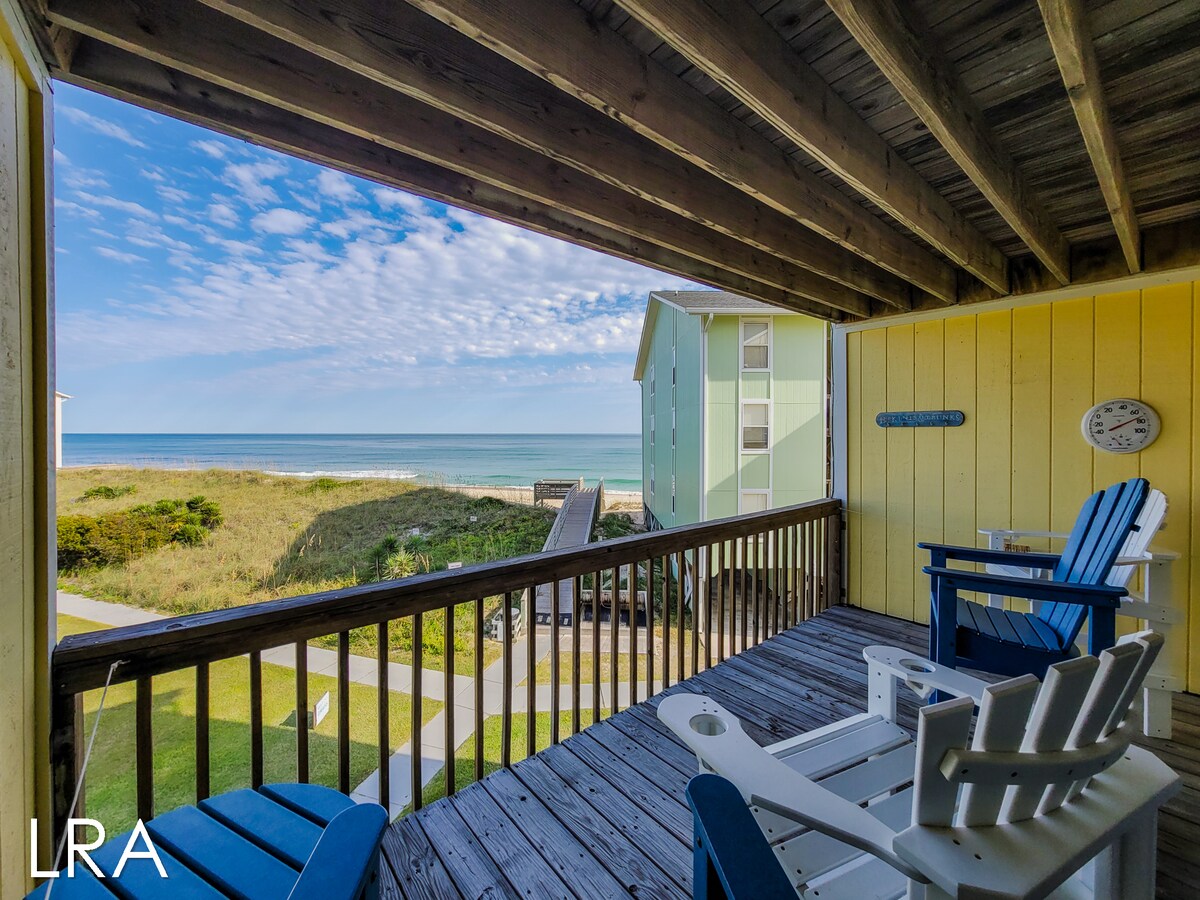 Beautiful beachfront condo with a fully stocked updated kitchen, glass walk in shower, LVP flooring, neutral paint. Gated entrance, private seasonal pool. We are right on the beach. Relax as you sit on the covered patio, enjoying the sound & view of the ocean, watch gorgeous sunrises & sunsets, dolphins. Go fishing or shark teeth hunting! We love to host and entertain our family & friends, so we treat our guests to the same! Minutes from Surf City Ocean Pier, local shops & restaurants.