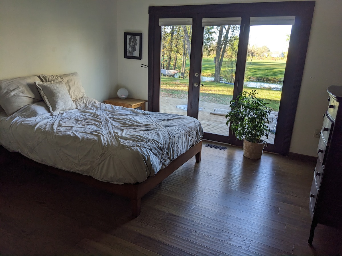 Magnifique cadre champêtre à 10 min de la ville, à côté de l'autoroute 59. Calme et paisible. Ferme unique de paons, avec étang de faune, cerfs et observation des oiseaux. Chambre privée dans une grande maison de 4 chambres. Salle de bain privée et accès à la grande cuisine/salle à manger, au salon et à la buanderie. Conduisez jusqu'en ville ou détendez-vous et faites des grillades sur la grande terrasse. Garage disponible. Accès facile au Sanford Medical Center et à DigiKey. Maison parfaite pour un séjour de courte durée à TRF ou un séjour plus long pour les affaires ou les loisirs.