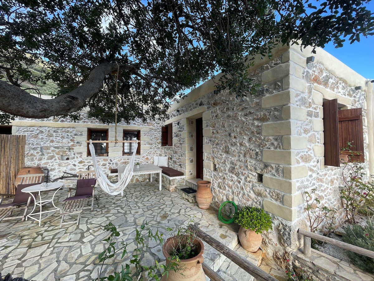 Charoupia cottage is part of 300 years old small hamlet, it is a Petite traditional cottage suited on the hillside among olive groves and carob trees overlooking the Mediterranean sea. In the valley of the White River and the gorge of Pefki Ideal for nature lovers, only 900m from the beaches, tavernas and shops of harbour town Makrigialos at the foot of the Pefki Gorge this area offers fantastic opportunities for those who love walking & nature With high speed internet & top quality mattresses