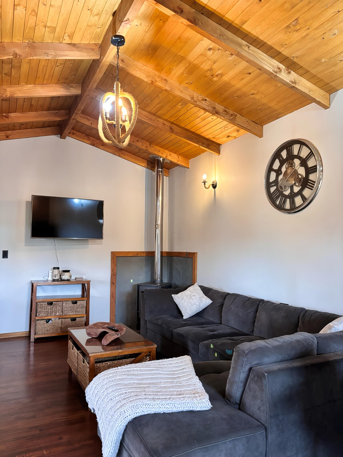La cabane « Cantos del Chucao » est le refuge idéal pour profiter de la nature, située à 2 km de l'entrée du parc national Conguillio, à Curacautín. Pouvant accueillir 6 personnes, il dispose de 3 chambres, d'une cuisine équipée, d'une télévision connectée, du Wi-Fi et d'une terrasse au bord de la rivière. Votre jarre privée (Prix : 35 000 $ à payer séparément le jour où vous souhaitez l'utiliser) et le grill sont parfaits pour se détendre et partager. Entourée d'une flore et d'une faune indigènes, elle offre un accès à l'aventure et au confort.