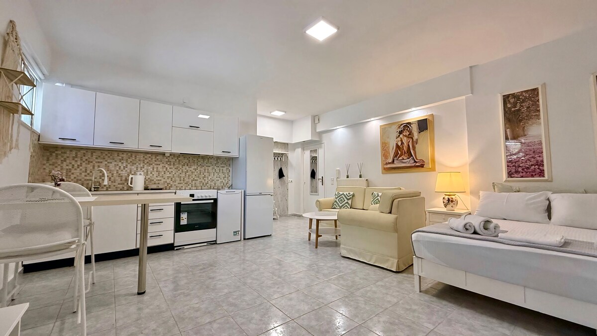 Lumineux, élégant, climatisé et entièrement équipé, ce superbe loft de 70 m2, Il offre wifi et peut satisfaire les besoins de 1 - 5 voyageurs. Les voyageurs ont accès à tous les appareils ménagers, l'équipement et les installations.Très bien situé dans un quartier calme de Kalamata avec des places de stationnement disponibles devant la maison jour et nuit et un accès facile aux endroits les plus historiques et touristiques de la ville. Il est près du centre-ville et de la plage.