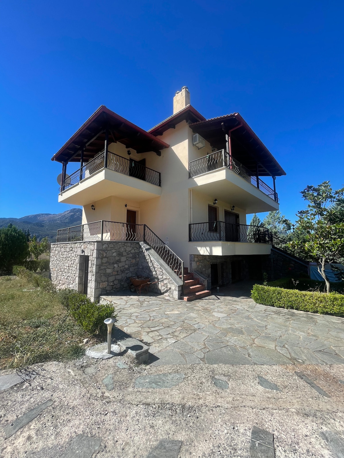La maison est entourée d'oliviers, d'orangers, de citronniers et plus encore, car la maison est au milieu d'un astate qui vous offre une vue magnifique. La maison est à 150 km d'Athènes( en voiture + ferry) ou 210 km (en voiture, en traversant les Chalkis). Il se trouve à 13 km d'Aidipsos, une célèbre ville thermale connue depuis l'antiquité. Le village de Gialtra, où vous pouvez trouver la plupart des magasins de base, est en haut de la colline, à distance de marche (10 à 15 minutes).