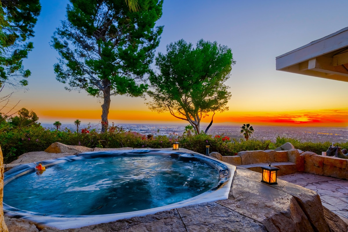 Vue sur Los Angeles Maison avec cour avec jacuzzi et lits King Size Luxe près de Disneyland Universal Studios après une longue journée à l'extérieur, venez profiter de votre maison avec vue sur la ville ci-dessous ! La maison de style resort Hilltop dispose d'une cascade de 12' conçue par un architecte avec des tortues d'étang à poissons ! Il s'agit d'une grande maison personnalisée de 3 chambres et 2 salles de bain avec un intérieur en bois et en marbre personnalisé. Ses espaces extérieurs sont parfaits pour se retrouver et profiter de la vue ! Situé à quelques minutes en voiture des sentiers de randonnée, des pistes cyclables, des magasins et des restaurants !
