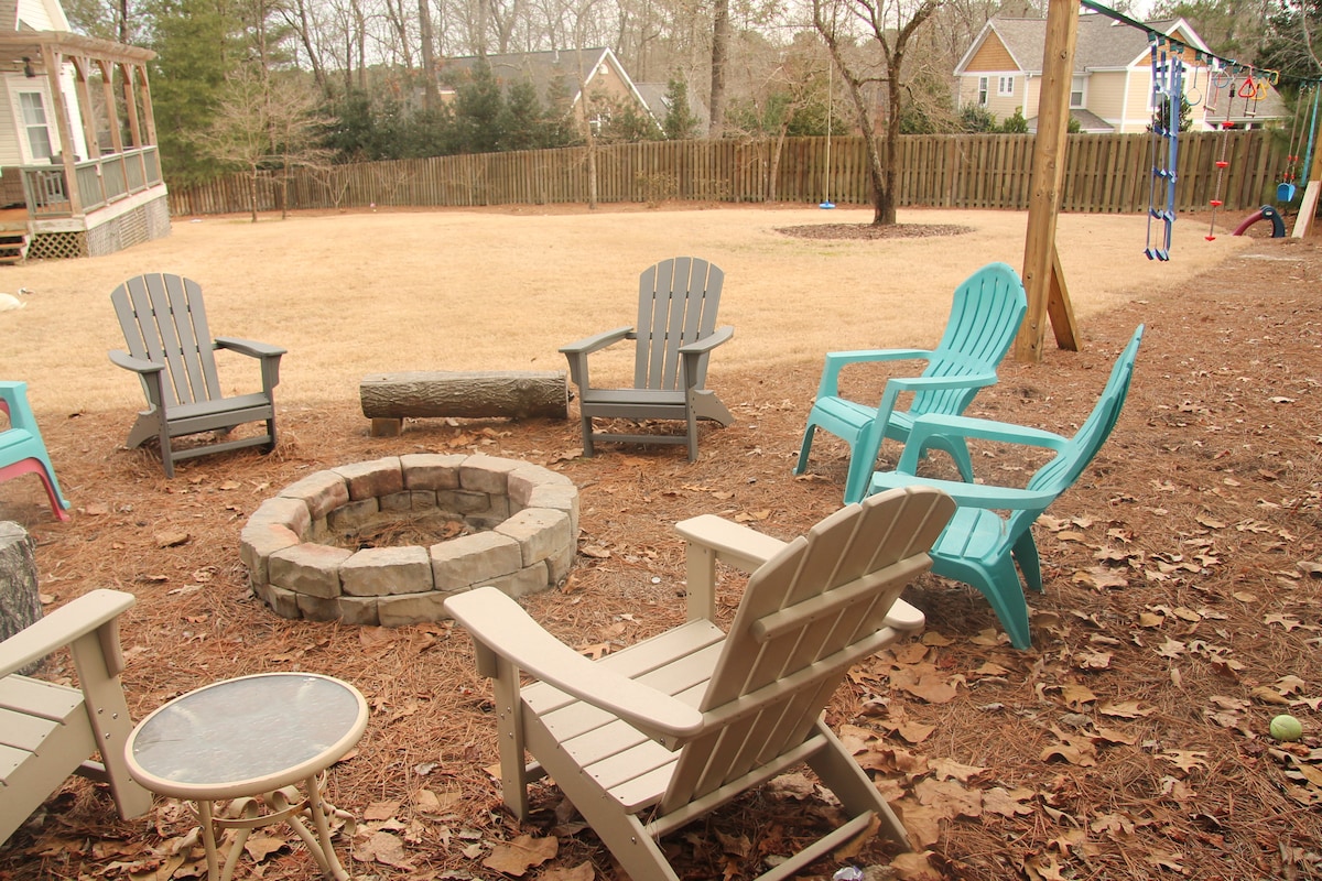 Profitez d'un logement confortable et central. À deux minutes en voiture du centre-ville de Southern Pines, à 15 minutes de Pinehurst et à quelques minutes du pays des chevaux. Nous avons tout ce dont vous avez besoin pour passer un séjour de rêve dans les Pines. Des tonnes d'équipements, notamment : Clôture dans l'arrière-cour Patio extérieur avec foyer et grill Foyer au bois Télévision connectée Lave-linge et sèche-linge Bureau Wifi rapide Thermostats intelligents Allée pour 2 voitures Cuisine entièrement équipée … et plus encore !