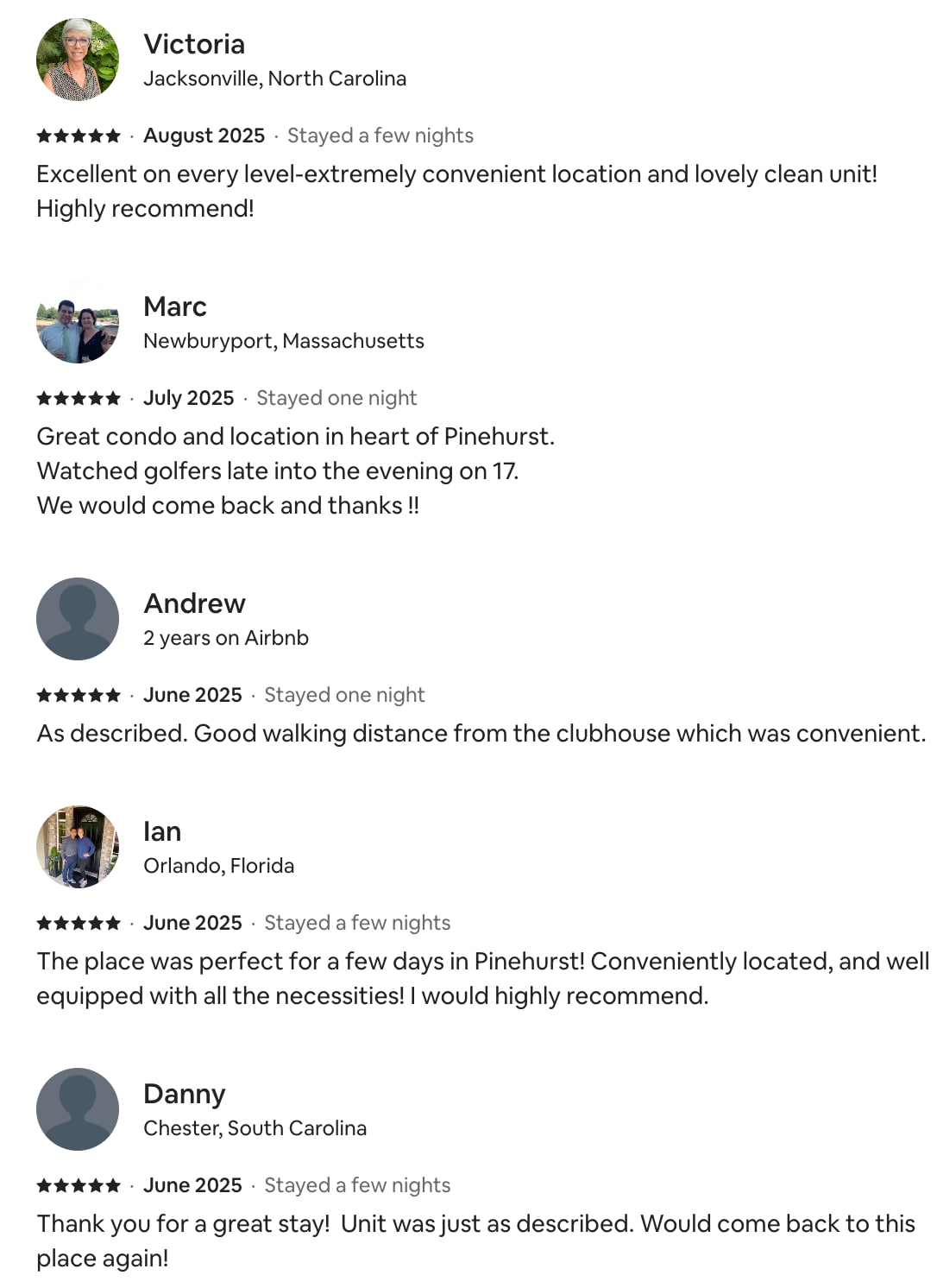 Pinehurst propose des logements très bien notés par les voyageurs, avec une moyenne de 4,9 sur 5 !