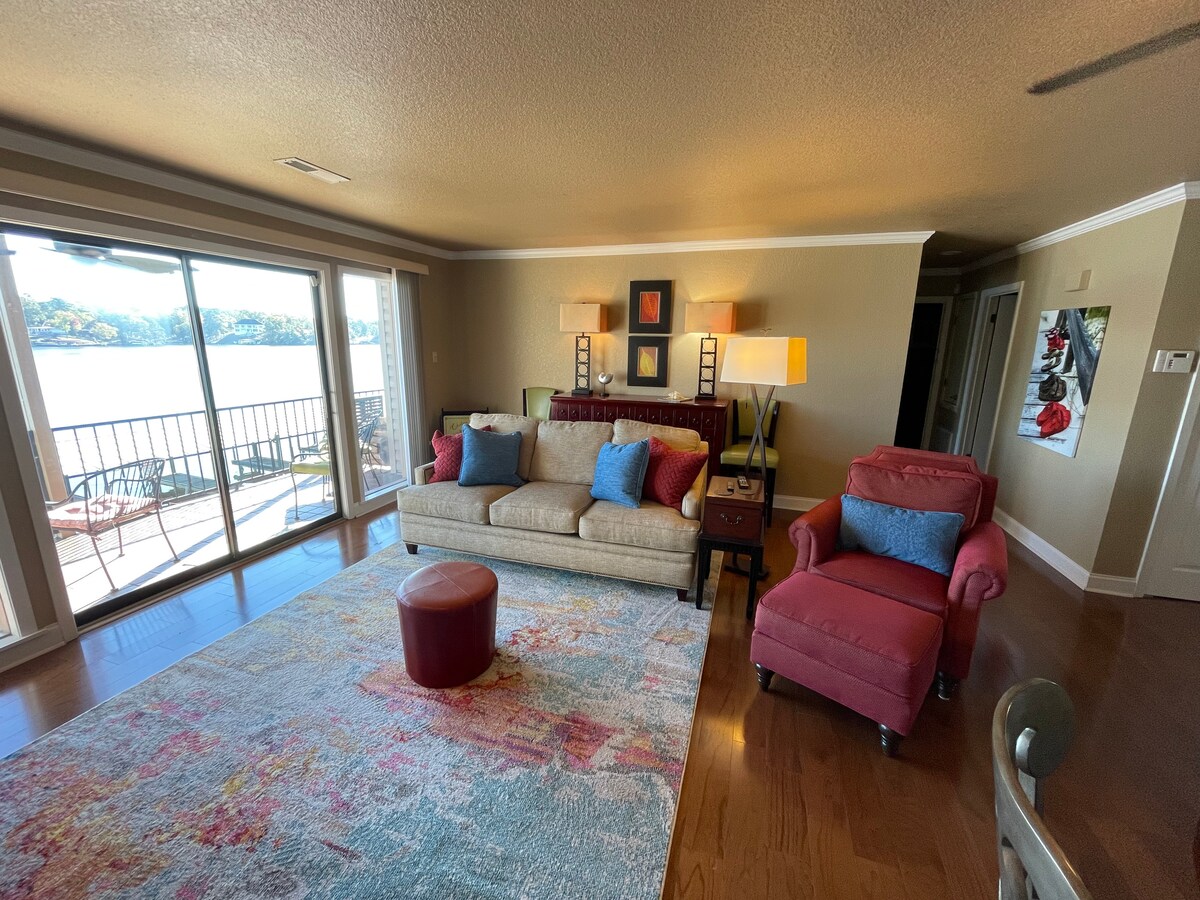 Magnifique appartement. Unité au rez-de-chaussée à quelques pas du lac. AMARRE DE BATEAU DISPONIBLE. Belle crique pour la baignade et la pêche. Remarque : bien qu'il s'agisse d'un condo au rez-de-chaussée, il y a des marches du parking jusqu'au logement. Joliment meublé avec un lit King Size dans la chambre et un canapé convertible Queen Size Tempur-Pedic. Deux salles de bains complètes permettent à cet appartement d'accueillir très confortablement 2 couples. Cuisine bien approvisionnée, buanderie entièrement approvisionnée dans le logement, téléviseurs intelligents avec Hulu Live dans les deux chambres.