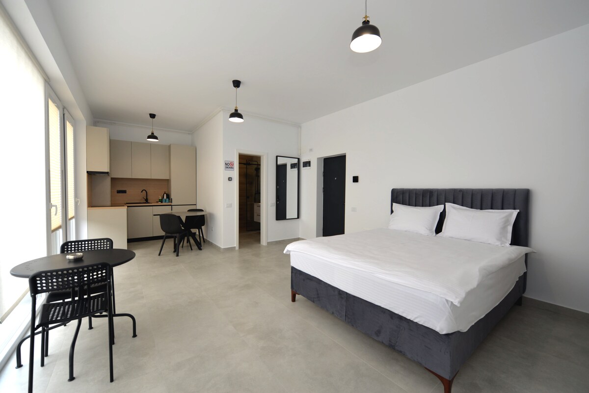 Bienvenue dans notre studio calme et élégant de la Plaza Residence à Bucarest ! Cette retraite urbaine confortable est l'endroit idéal pour se détendre après une journée à explorer la ville. Notre emplacement est à proximité de deux grands centres commerciaux, Plaza Shopping Mall(400 m) et AFI Palace Mall(1,2 km) - offrant des cinémas, des restaurants et des boutiques pour votre divertissement et votre commodité Les options de transport en commun sont également facilement accessibles, bus/tramway(50 m) et métro(800 m), ce qui facilite l'exploration de Bucarest.