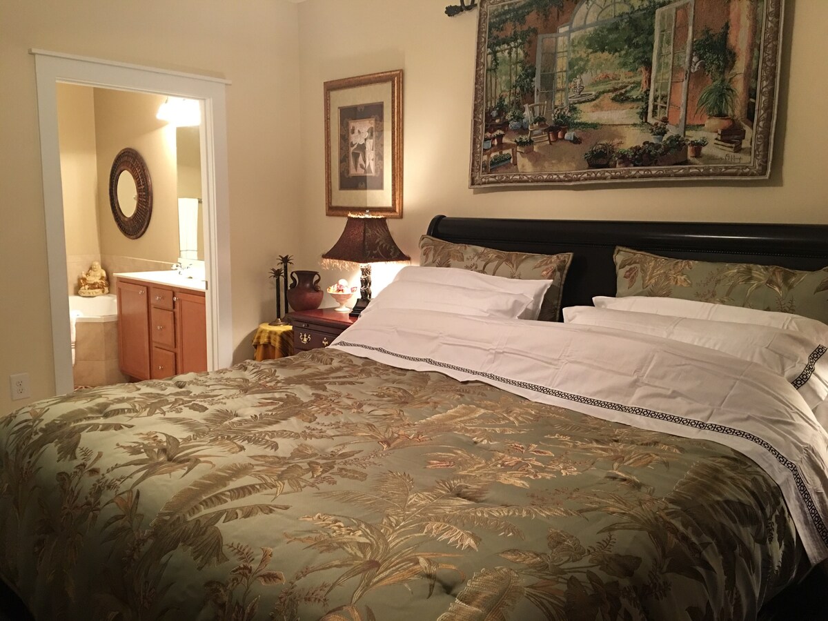 Détendez-vous et rechargez-vous dans cette chambre principale avec une salle de bain privée luxueuse. C'est un espace élégant avec un mobilier moderne et de nombreux équipements pour un séjour confortable, y compris un piano et une piscine. Ce logement situé au centre de Greenville offre un accès facile à tous les sites et commodités. Vous trouverez de nombreux magasins et restaurants aux alentours. Elle est à 4 min de l'ECU, à 11 min du Vidant Medical Center, à 4 min du centre commercial Greenville Mall et à 8 min du centre de congrès. La durée de séjour✱ minimum est de 28 nuits. ✱