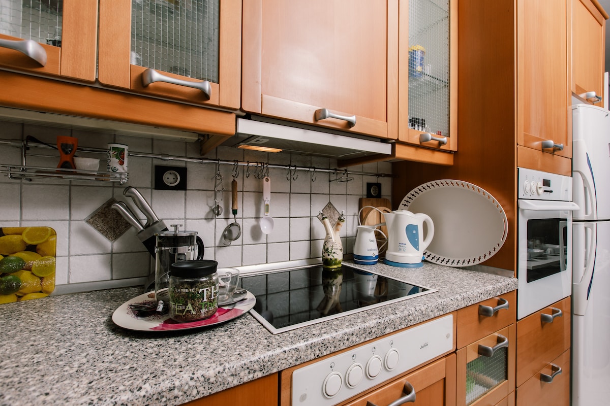 Studio flambant neuf avec une décoration moderne comprenant un lit Queen Size unique et des dessins de faux plafonds complexes (38 m²). Le studio est situé au centre de la ville et est à moins de 10 minutes de l'aéroport et de nombreux centres commerciaux. À 3 min à pied, vous pouvez voir la place de la ville et en 10 min, vous pouvez être au barrage de Thermi. Si vous avez envie de nager, vous pouvez visiter la Chalcidique en 30 minutes.