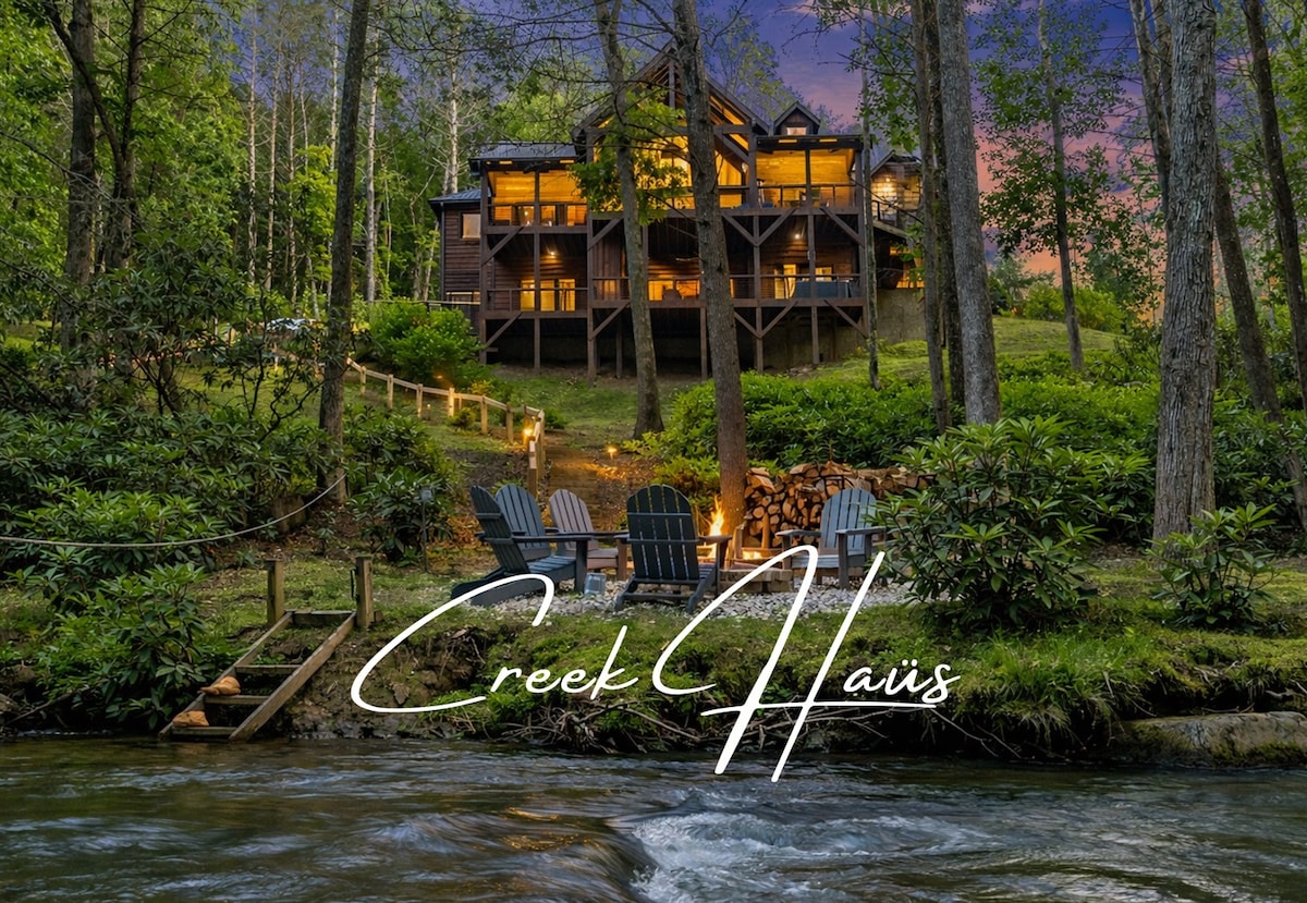 Welcome to The Creek Haüs, a luxury mountain cabin in Blue Ridge designed for connection, comfort, and unforgettable stays. This stunning 6-bedroom retreat features multiple entertainment spaces, a movie lounge, game room, two kitchens, a hot-tub retreat, fire-pit, and direct creek access for floating and relaxing. Under 15 minutes from downtown, perfect for elevated group getaways, wellness escapes, and memory-making in the mountains.