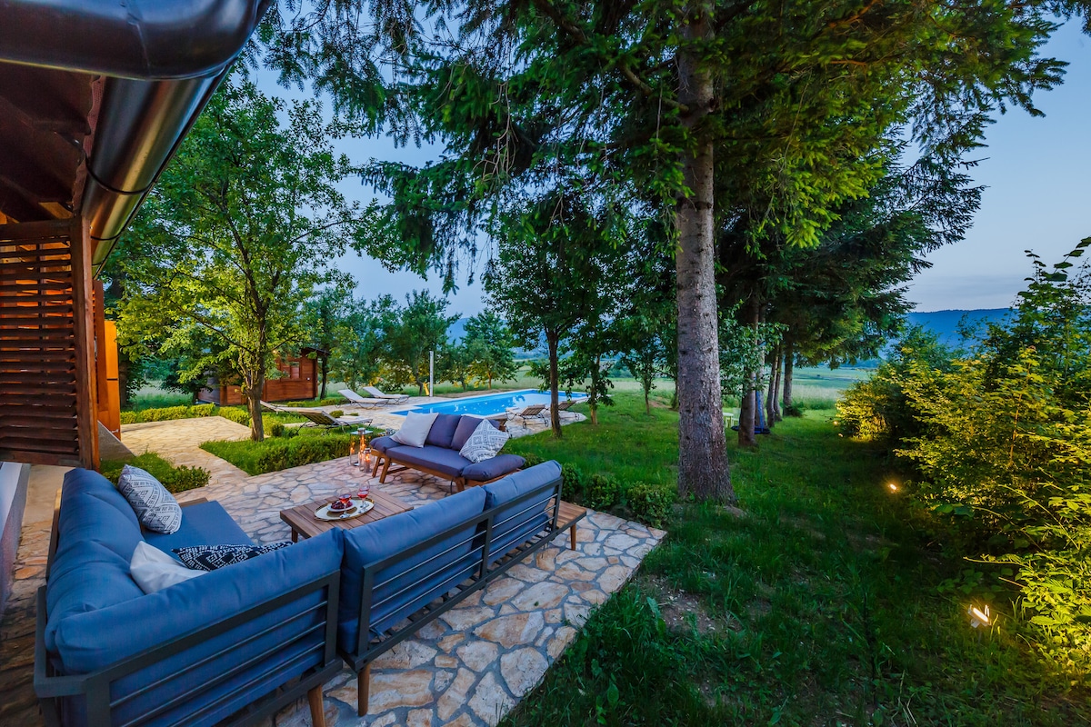 Le domaine VITA NATURA est situé dans un environnement naturel unique à proximité immédiate du parc national des lacs de Plitvice, sur une colline ensoleillée entourée uniquement de calme et de tranquillité. Le domaine, situé sur une prairie spacieuse, se compose de deux maisons en bois faites de matériaux naturels, et est entièrement meublé avec des meubles uniques en bois massif faits à la main produits par des artisans locaux, ce qui confère à la maison un confort et une chaleur particuliers.😀