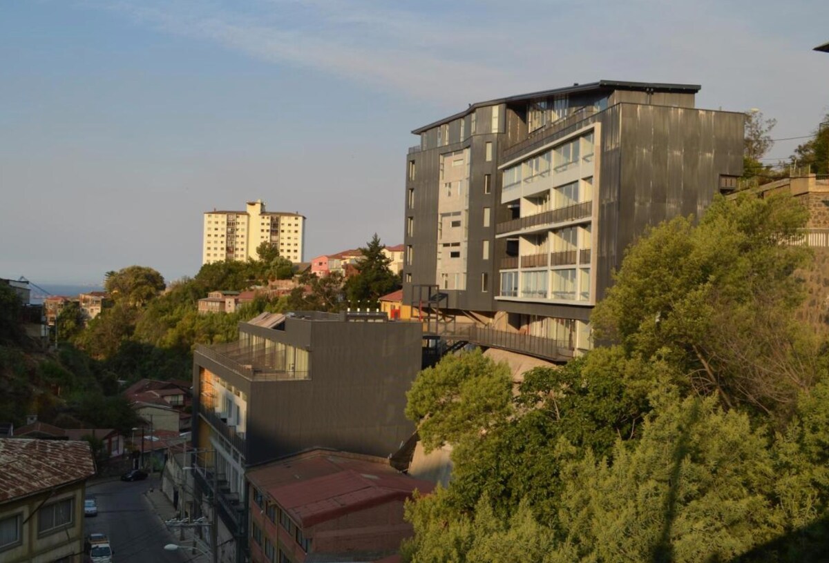 Departamento moderno, ventanas termo panel, cocina de vitrocerámica y cuarzo, su diseño vanguardista harán que tu estadía sea memorable y placentera. Terraza compartida con vista de todos los cerros y la bahía de Valparaíso, con alcance desde Valparaíso hasta Quintero por la costa, se puede apreciar las cordilleras de la costa y de los Andes. Excelente conectividad, su ubicación privilegiada está a solo pasos del emblemático Paseo 21 de Mayo, ascensor Artillería y Frente al Museo Marítimo.