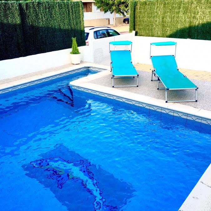 Grand salon avec air conditionné et ventilateur au plafond qui communique avec la cuisine Trois chambres à coucher. 1 grand lit. 4 simples. Grands placards. Ventilateurs plafond. Machine de climatisation dans la zone des chambres et des salles de bains. Grande salle de bain complète avec une grande douche et une autre toilette. Grande terrasse avec mobilier de jardin et barbecue. Terrasse supérieure. Piscine avec solarium et jardin. Parking privé à l'extérieur de la clôture, devant la maison.