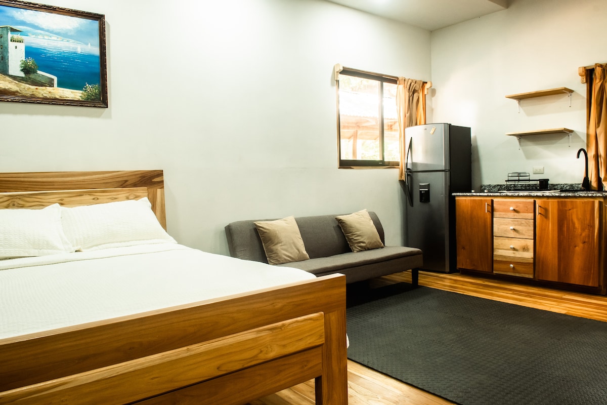 Bienvenue au complexe Casa Aire. Le complexe Casa Aire est un développement écologique avec cinq maisons uniques. L'appartement dispose de 1 chambre, 1 salle de bain et un canapé-lit dans le séjour. Il peut accueillir confortablement 3 personnes. Tous les styles de maison sont isolés pour une efficacité énergétique et entièrement meublés. Le Guanacaste et d'autres bois locaux sont utilisés dans la décoration intérieure. La propriété dispose d'un terrain et d'un personnel de sécurité sur place. La zone commune générale est partagée pour le stationnement entre les autres unités.