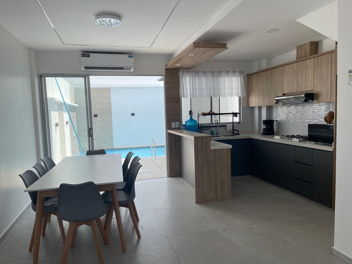 Located in Playas Villamil, three blocks from the beach and 0.5 km from shops and restaurants. The villa offers six bedrooms, each with a private entrance and air conditioning. Five rooms include a private bath, hot water, hair dryer, iron, shampoo, soap, and lotion. Guests enjoy exclusive access to the pool and cabana, Jacuzzi, bar, barbecue, and spacious outdoor area. The villa also features a full kitchen with an oven, stove, microwave, cookware, dishes, and utensils.
