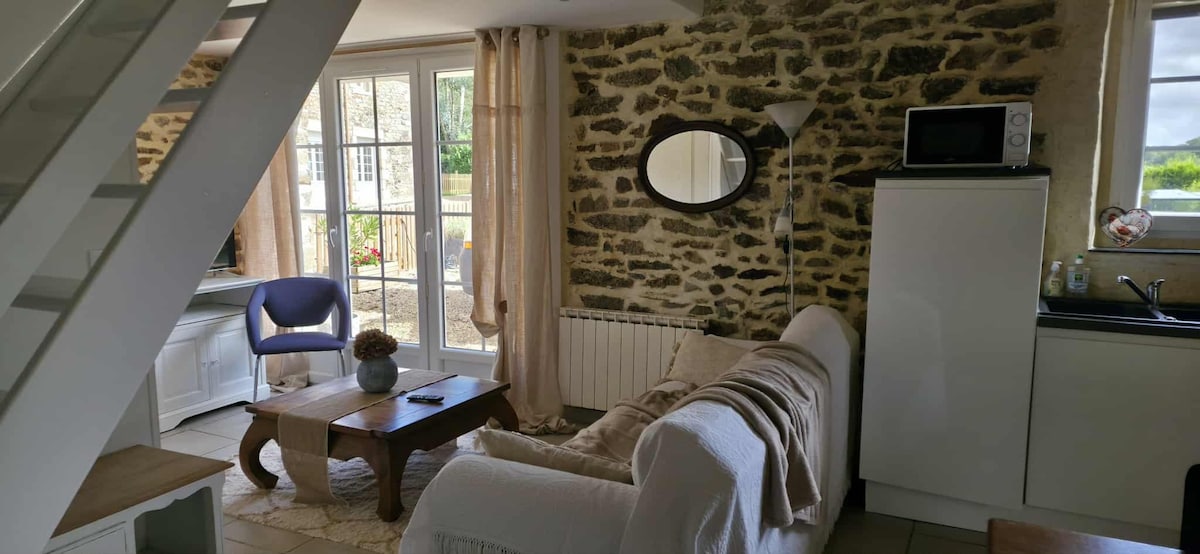 En bretagne sud, en campagne, aux portes de Lorient, à quelques kilomètres des plages nous proposons un logement douillet et chaleureux pour deux, idéal pour une pause au grand air...Nous vous accueillons au sein de notre ferme familiale ou nous élevons Ovins, poulets, et poules pondeuses. Dans une longère, 2 pièces refaites à neuf avec cuisine équipée. Espace repas et petit coin télé. Le coin nuit est composé d’une chambre et d’une salle d’eau attenante.