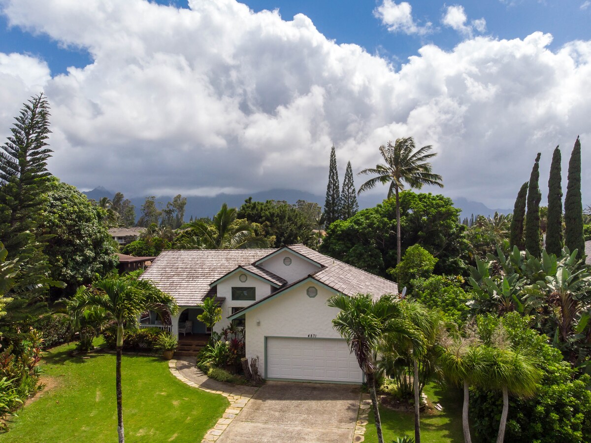 Résidence unifamiliale avec cour avant et arrière. De merveilleux alizés gardent la maison fraîche et agréable toute l'année. Détendez-vous sur l'une des lanais avant ou arrière. La maison est équipée de tout le nécessaire pour passer le meilleur séjour possible à Princeville, Kauai. Vous aurez tout le logement pour vous, alors installez-vous et faites comme chez vous. Situé dans une rue très paisible dans un quartier résidentiel.