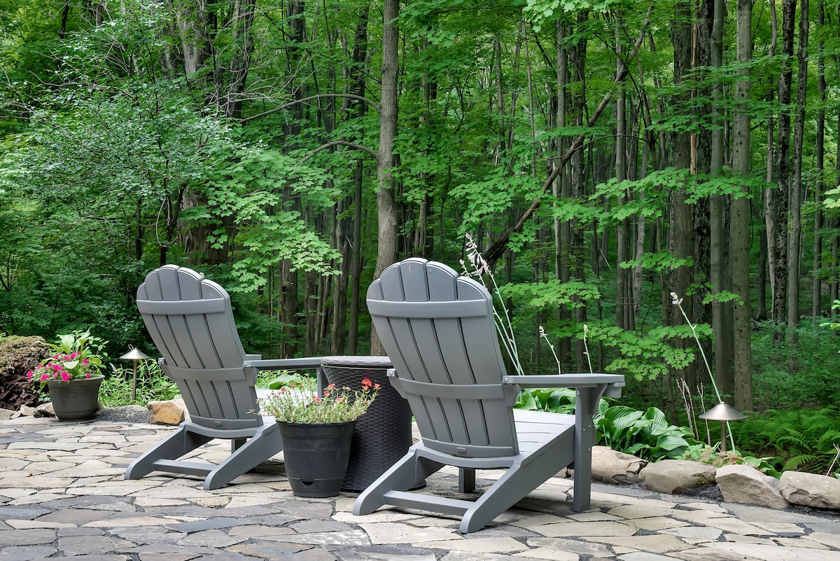 Évadez-vous dans cette retraite moderne et confortable où la nature vous entoure. Endormez-vous au son des hiboux, des grillons et des grenouilles. À seulement 2 minutes de Rosendale et à quelques minutes en voiture de Kingston, New Paltz et Stone Ridge, avec des restaurants et des sentiers à proximité. Profitez d'un foyer au gaz, d'un coin lecture avec vue sur la cime des arbres et d'une grande terrasse qui donne l'impression d'être dans les arbres. L'espace extérieur privé comprend un foyer, le tout sur un terrain serein de 3 acres offrant une paix et une tranquillité totales. Votre escapade parfaite dans la vallée de l'Hudson vous attend !