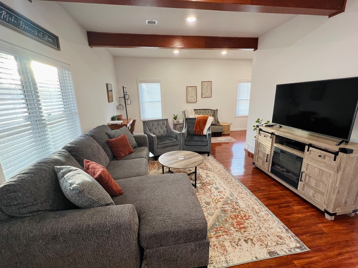 Bienvenue au Santa Fe Inn ! Il s'agit d'une maison de 2 chambres et 2 salles de bain récemment rénovée avec des caractéristiques nouvelles et élégantes. Elle comprend une cuisine complète avec micro-ondes, réfrigérateur, lave-vaisselle, cafetière et grille-pain. La buanderie comprend un lave-linge, un sèche-linge et du détergent pour votre usage. Roku TV avec Netflix et d'autres applications incluses. Cette maison est bien approvisionnée. Cette maison se trouve sur un grand terrain d'angle avec un garage double et une grande cour ! Beaucoup d'espace pour vos remorques, voitures de course, bateaux, etc.