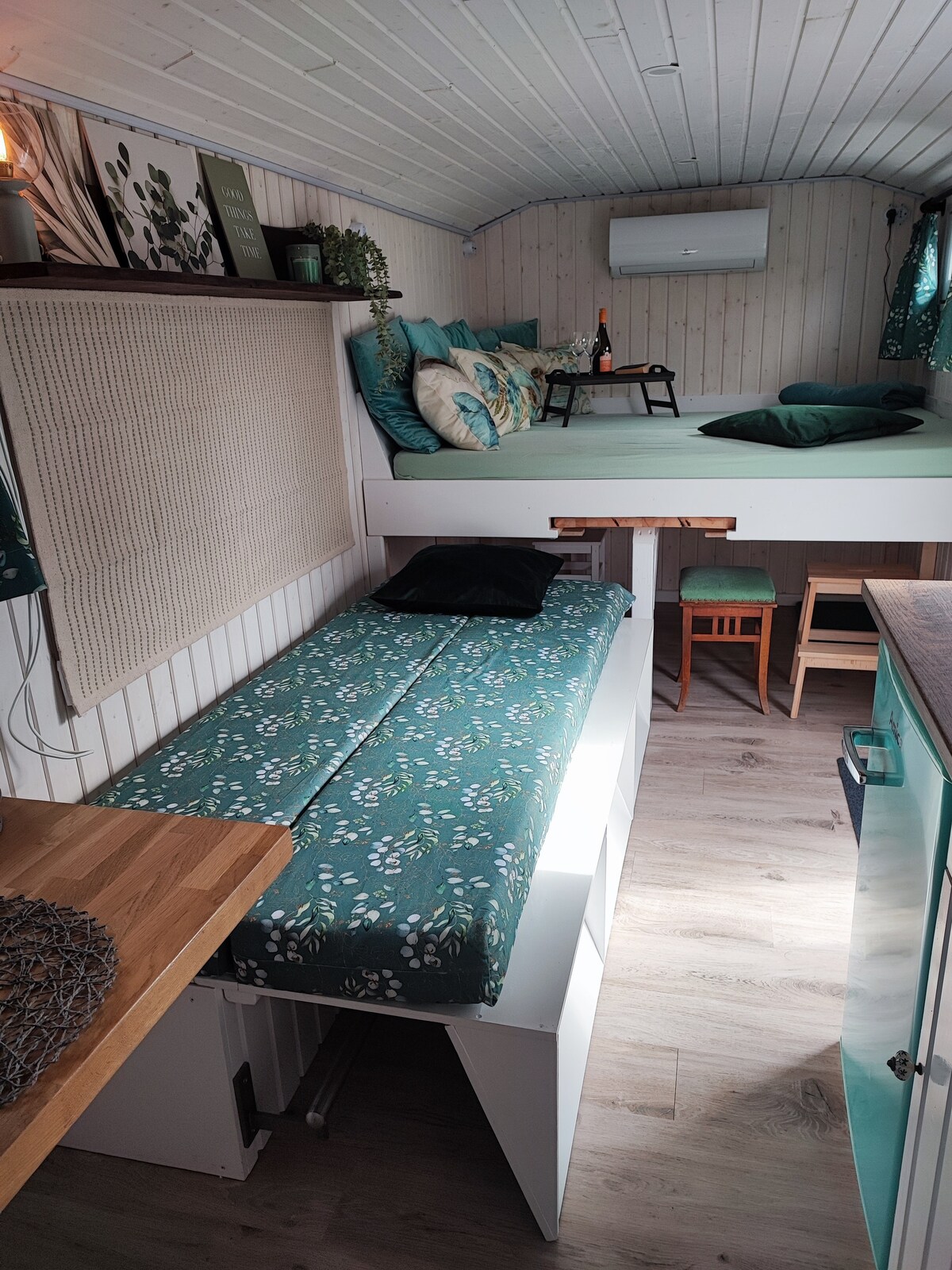 profite du calme au cœur de la région des lacs du Mecklembourg dans notre roulotte upcyling et bois ton premier café le matin sur la terrasse ensoleillée avec vue sur les chevaux et le soir un délicieux vin la nuit étoilée, grand lit (au moins 2 pers.),canapé à déplier et lit d'appoint (matelas sous le lit mezzanine possible), roulotte de chantier sur une petite place de caravane,nouveau conteneur sanitaire,Body Cult (salle de sport ci-jointe), cour de poney (leçons d'équitation possibles), linge de lit pour 10 €par personne