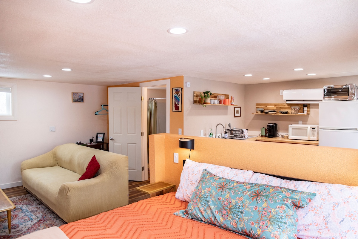- Pets welcome after disclosure of breed/type for $25. - $20 for each additional pet will be billed separately through the resolution page. - Beautiful front yard with mountain view and charming patio - Cozy living area - 2 bedrooms with queen beds - Bathroom with walk-in shower - Full kitchen - Free WiFi - 3 smart TV’s - Fenced backyard, gas grill, fire pit & seating - Free onsite parking - EV charging outlet, adaptor may be required ($10 per day) - Washer & Dryer - Children welcome!