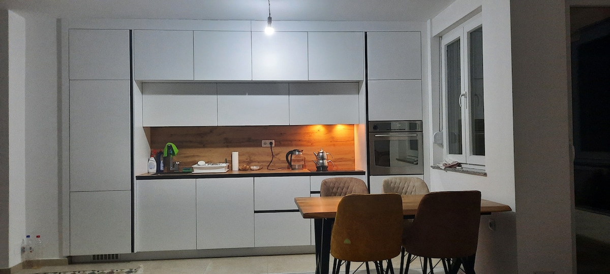 Located in the very heart of Prishtina, directly in the main city square, this apartment sits in a fully walkable, pedestrian-only area with no car traffic. Cafés, restaurants, bookstores, and cultural spots are all just steps away. As expected for such a central and vibrant location, the surroundings are lively, especially during the day and evening. The apartment features a smartly designed kitchen that can transform into a living area, with deep, rich tones creating a warm urban atmosphere.