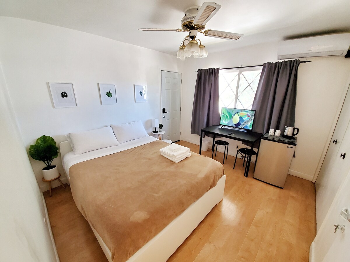 Studio agréable et propre dans une belle maison de banlieue. Détendez-vous, séjournez dans un quartier calme et abordable, et explorez le sud de la Californie ! À proximité de nombreuses attractions. Économisez de l'argent en restant en banlieue et en utilisant Uber pour vous rendre à nos attractions locales ! Salle de bain privée, kitchenette et entrée.