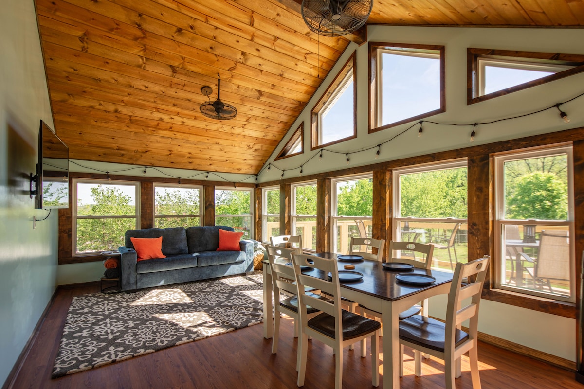 Détendez-vous dans cet endroit confortable. À seulement 10 miles de Fort Leonard Wood. À 1,5 km du club de sanctuaire Pulaski. Construit 22/10. Profitez de cet espace qui dispose d'un joli porche avant avec une belle vue sur notre étang. Fire Pit. Suite King Size 1 lit et vanité dans la chambre principale. Salle de bain, cuisine complète avec café/crème à thé, coin salon et coin repas. Parfait pour les couples, groupes de deux. Il s'agit d'une cabane sœur si vous souhaitez vérifier la disponibilité d'une cabane confortable 2 pour les grands groupes.