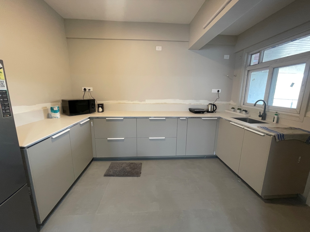 Welcome to our brand-new, spacious 2-BHK apartment, ideal for families and couples seeking comfort and convenience. The bedrooms have queen size beds with orthopedic mattresses and AC for a restful night's sleep. Relax in the large living room with a 43-inch Smart TV, lightning-fast WiFi and a dedicated dining area. Comes with two super clean bathrooms stocked with bath essentials. The fully equipped kitchen includes high-quality appliances and crockery for your culinary adventures!