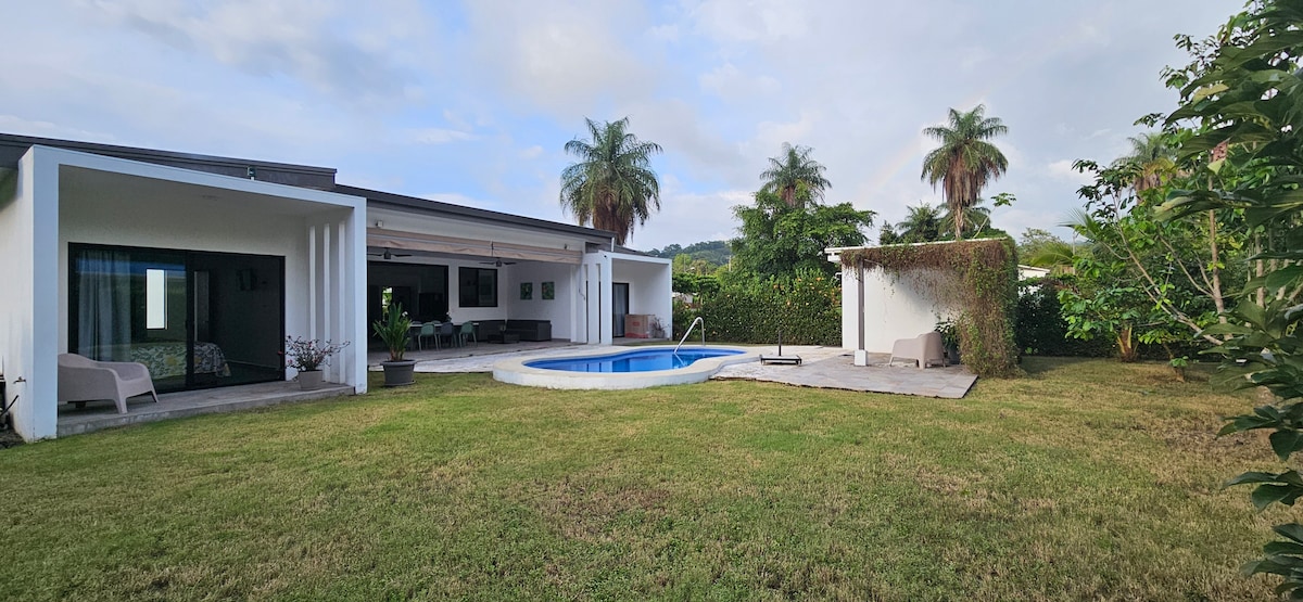This new home, developed with modern architectural design, an open floor plan and 50% green areas, awaits for you! At only 600 meters from the beach (10 min). The house has 3 bedrooms fully furnished with unique and custom furniture handcrafted by skilled Costa Rican craftsmen. Has a private pool and the ONLY house with a private back patio/terrace for gatherings. This is a gated community, with 24/7 security guard. This house will make you feel welcome, safe and relaxed. Enjoy your visit!