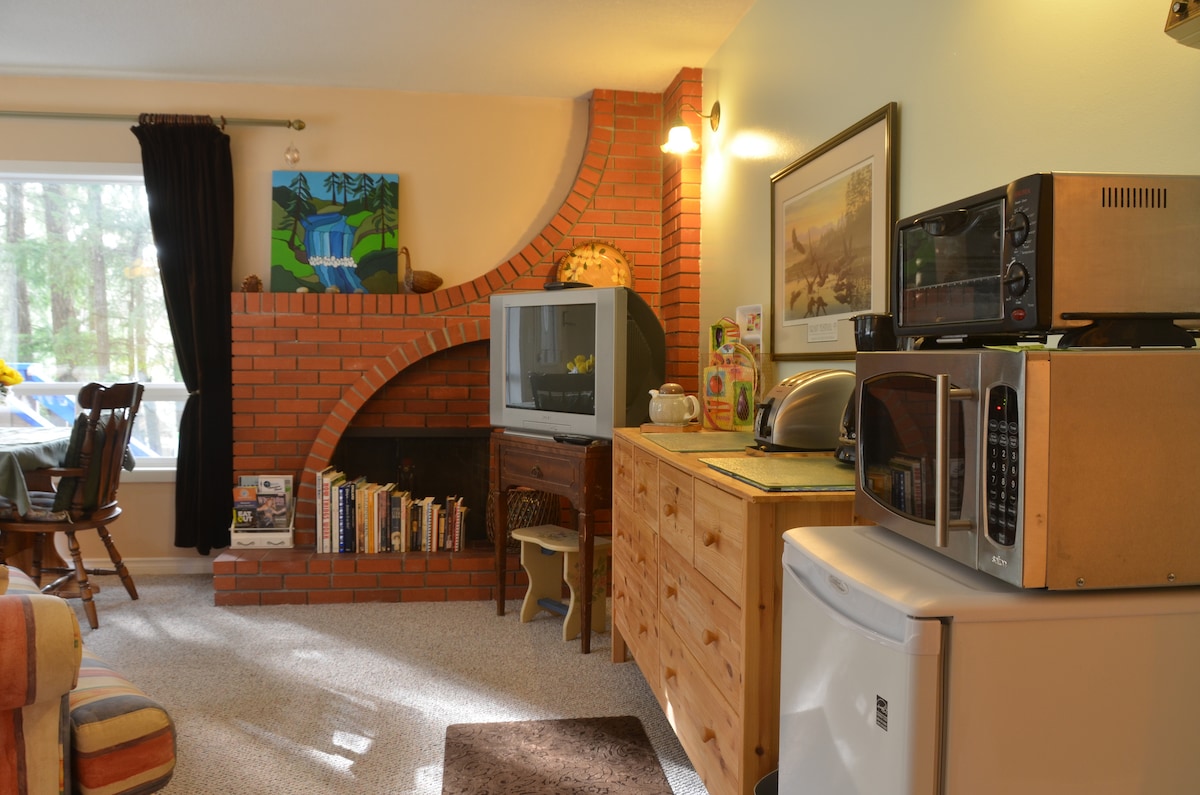 Suite lumineuse et aérée au-dessus de notre garage avec vue sur la forêt et les jardins. L'espace dispose d'une cuisine complète, d'un lit et d'un canapé confortables, le tout ouvert. Profitez d'une abondance de lumière naturelle grâce aux fenêtres et aux puits de lumière. L'espace comprend également une salle de bain 3 pièces et une petite table et 2 chaises pour dîner ou à utiliser comme poste de travail. Nous sommes situés juste à l'extérieur de Parksville dans une zone rurale. C'est un excellent emplacement central pour explorer l'île et à seulement 10 minutes du centre-ville de Parksville.