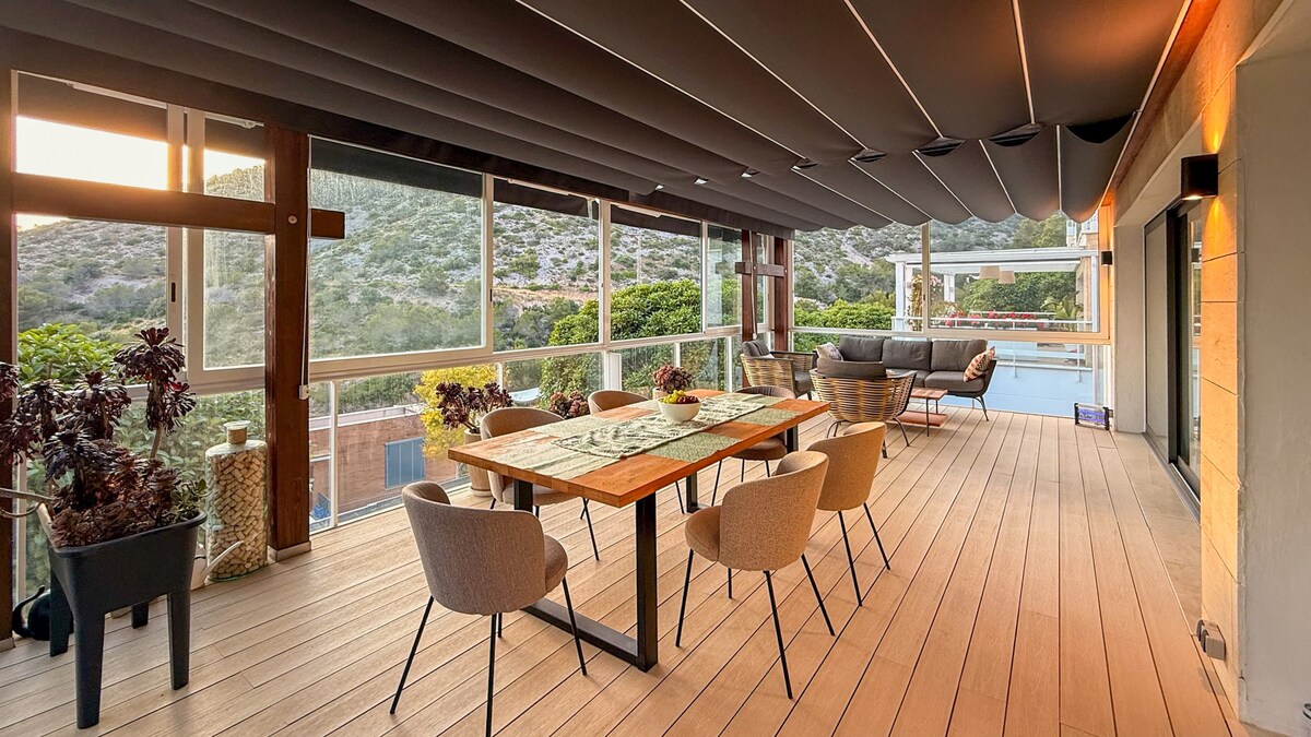 Profitez de l'élégance et du confort dans cette magnifique villa avec beaucoup d'espace située dans un quartier très calme avec vue sur mer et montagne. Entièrement équipée, elle dispose de trois chambres spacieuses,d'un playroom où les plus petits peuvent jouer, de trois salles de bains avec douche et baignoire et d'une cuisine spectaculaire. Dans le jardin un grand picina privé et un porche très confortable à côté d'une cuisine extérieure avec barbecue et salle de sport avec machines . Il n'a jamais été aussi facile de déconnecter !