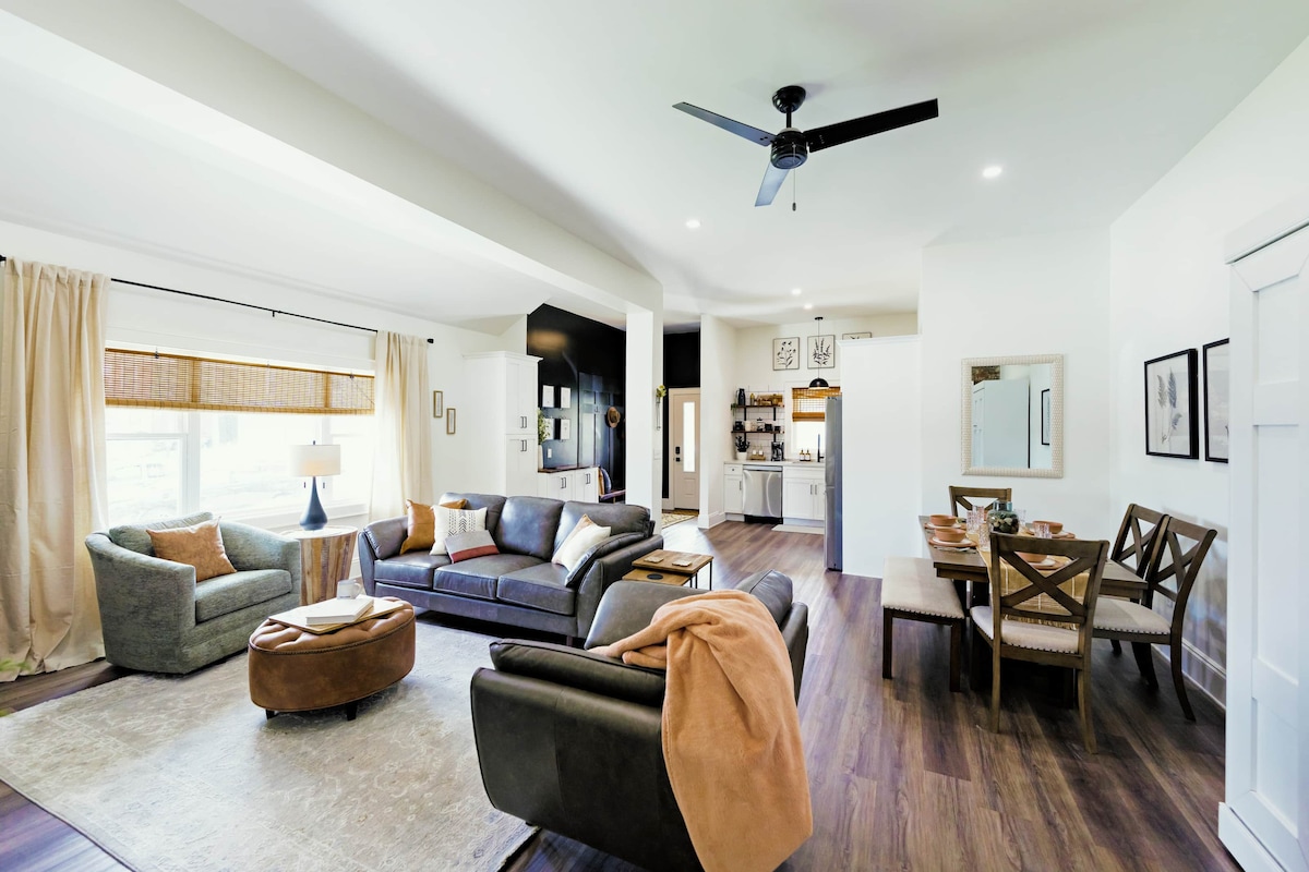 La maison de ranch moderne de nouvelle construction présente un design rustique haut de gamme avec de beaux intérieurs confortables et du confort à chaque tournant. De superbes vues vous attendent avec des fenêtres du sol au plafond donnant sur la magnifique Silver Creek et la nature environnante. La terrasse privée est spacieuse et accueillante avec un jacuzzi surdimensionné, un foyer en béton, un barbecue à gaz et un mobilier de salle à manger en plein air. À quelques minutes d'excellents restaurants, de la brasserie Garrett's Mill et du café le plus cool. Escapade de week-end ou séjour d'affaires parfait.