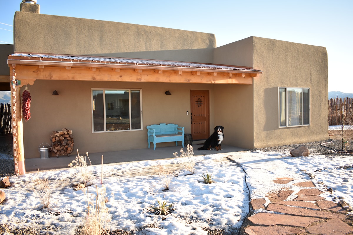 Dos Caminos Casita offre une vue tranquille sur la montagne dans une casita traditionnelle en adobe construite il y a plus de 100 ans avec des équipements modernes, de la lumière naturelle, des poutres Viga au plafond et de beaux carreaux. Si vous êtes à la recherche de confort, de détente et de belles vues, vous l'avez trouvé ici à Dos Caminos Casita. Profitez d'un bain dans notre jacuzzi minéral pendant que le ciel de Taos peint une toile de violet, d'orange, de bleu ou de rose riche. Espace parfait pour se retirer après une journée de randonnée, de rafting ou de ski.