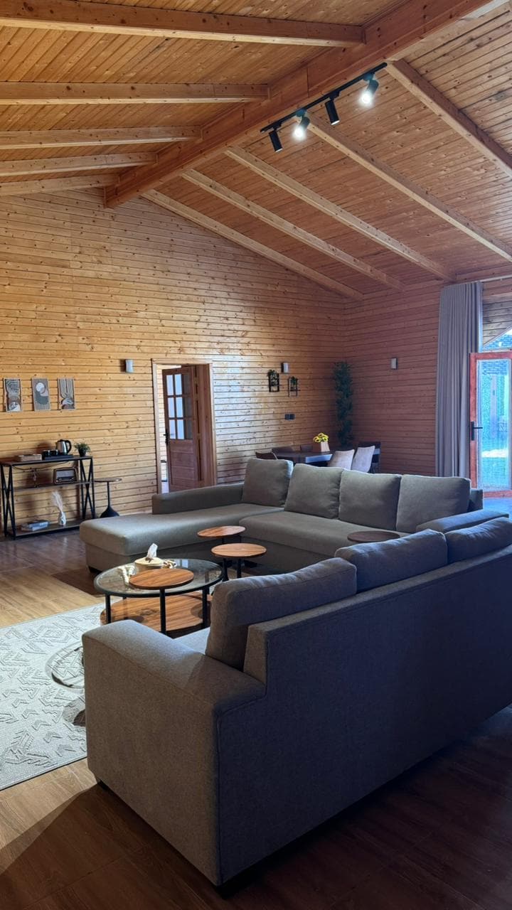 Un chalet moderne avec un style rustique et une vue spectaculaire composée de : Chambre de mariage (salle de bain pour 2 personnes - lit de massage - canapé relaxant - salle de bain privée). Une autre chambre avec deux lits . Un grand salon avec vue sur la piscine avec de nombreux jouets pour adultes et enfants et diverses activités. Piscine cristalline avec chaises longues. Piscine pour enfants avec jeux d'eau et séance de dos sur la piscine. Barbecue équipé d'un bar extérieur Une session d'arrière-plan et un service de format peuvent être ajoutés pour vos événements .