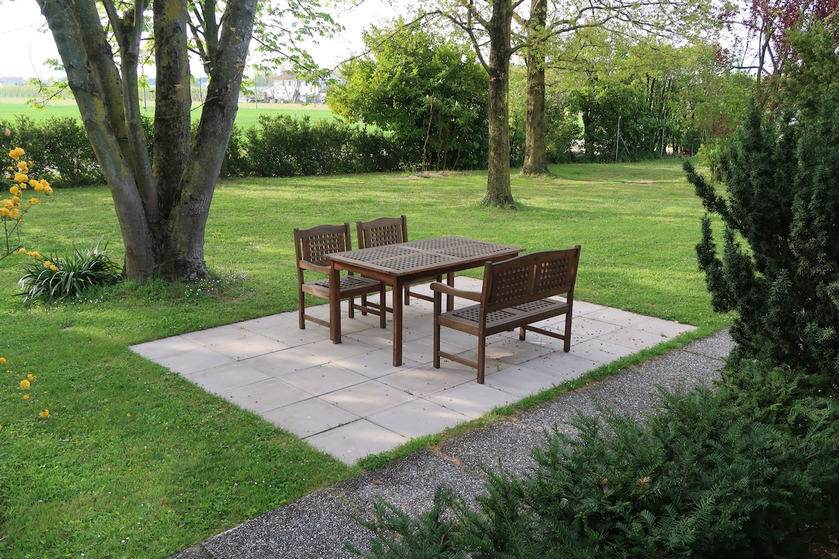 Une élégante suite au premier étage, un grand jardin, des tables et des chaises sous le porche. Des environnements climatisés pour un séjour sain et confortable. Nous sommes à 1 km du centre, dans un quartier calme, avec un parking extérieur gratuit ; à 200 mètres, dans la Via Cova, il y a l’arrêt de bus (ligne 1, pour Google ligne 51) qui mène au centre et à la gare, de là une autre ligne pour les centres commerciaux « La Filanda » et « Le Maioliche ». Nous fournissons des vélos à usage gratuit, moyennant une caution de 100 euros chacun.