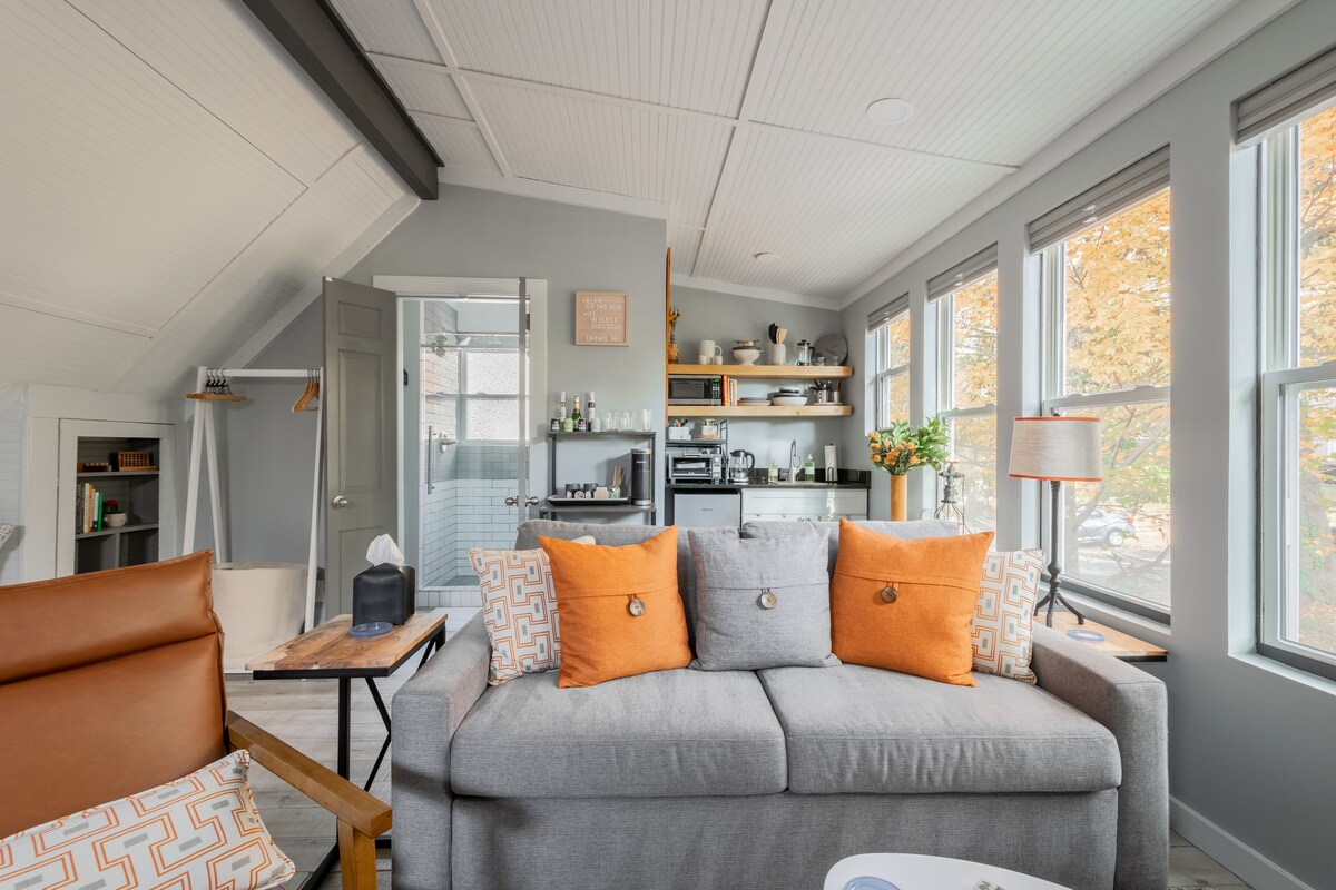 NEW FOR 2026: 50" TV in Bedroom. Shower Shampoo / Body Wash Dispenser NOTE: Guesthouse sleeps 2-3 adults or 2 adults and 2 kids Cozy one bedroom 2nd level carriage house apartment. Secure, gated, off-street parking and coded door for seamless entry. Features include high speed internet, 43" Roku Smart TV, large frameless glass-door shower, Keurig Mini, and all needed amenities for an enjoyable stay. Home is on a quiet street and walkable to park, golf course, and nearby restaurants.