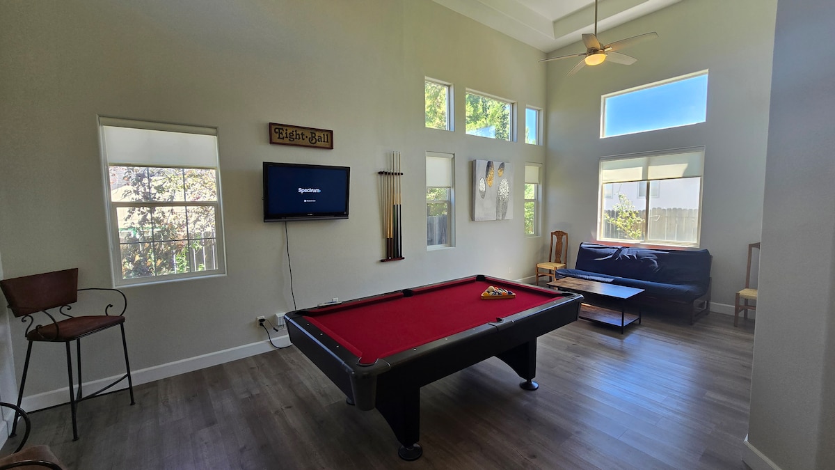 Nettoyée par des professionnels, cette maison spacieuse est située dans un quartier sûr du nord-ouest de Reno, dans un cul de sac calme. Idéale pour les groupes de taille importante !À distance de marche des sentiers de randonnée pédestres et cyclables. À 7 min du centre-ville de Reno, à 35 min de Truckee et à 45 min du lac Tahoe. Accès facile à l'autoroute. Cour arrière entièrement clôturée avec foyer et barbecue. La maison peut accueillir de grands groupes avec 5 lits et des espaces de divertissement séparés. Wi-Fi fourni. 6 téléviseurs avec Chromecast.