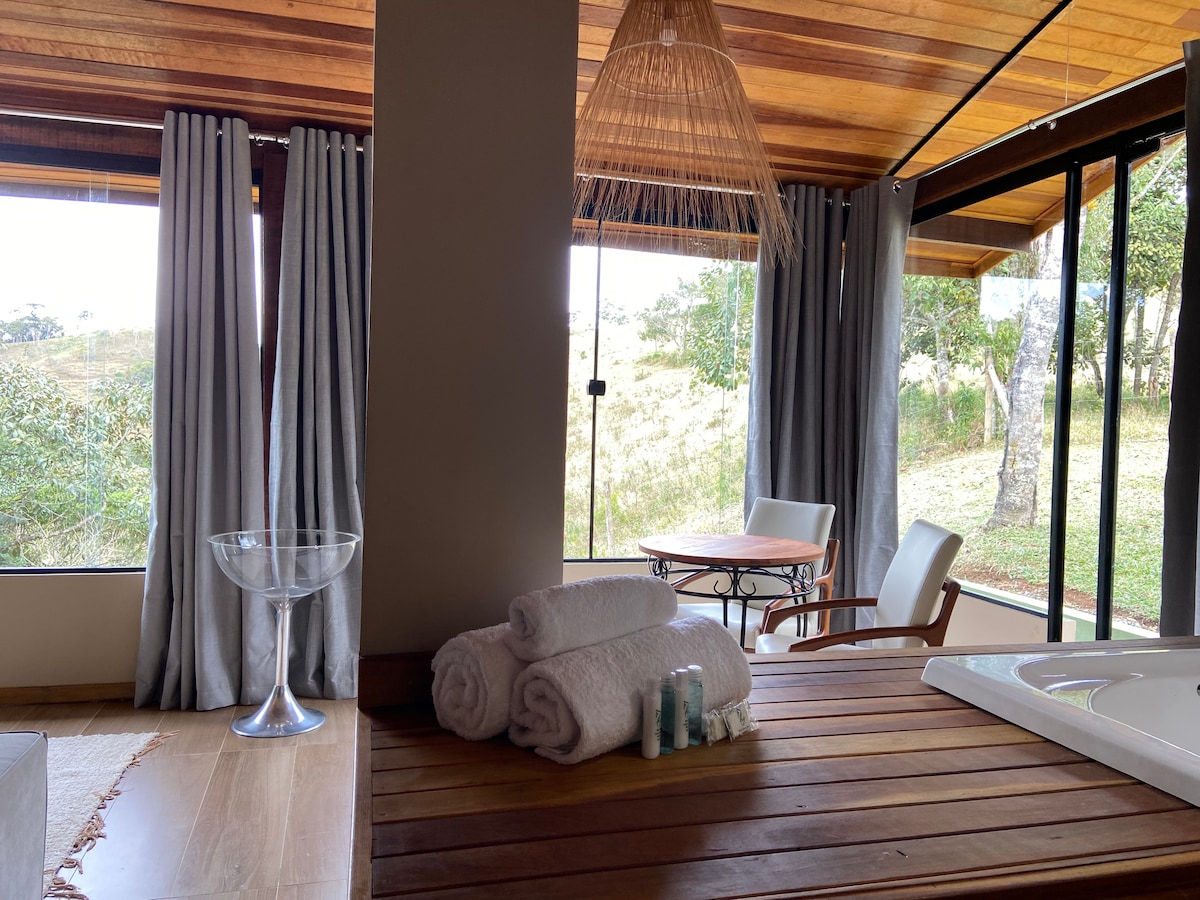 Détendez-vous dans cet espace calme et élégant. Avec une vue spectaculaire sur les montagnes de la Serra da Mantiqueira, notre refuge a été conçu pour profiter pleinement du magnifique paysage qui l'entoure. Située au sommet d'une montagne avec une vue à 360 degrés, y compris le pic Agulhas Negras, la maison offre un confort total et l'intimité pour des moments de détente à côté de la nature intacte, avec accès à la cascade de la propriété et un sauna à bois semi-humide avec une vue surprenante.