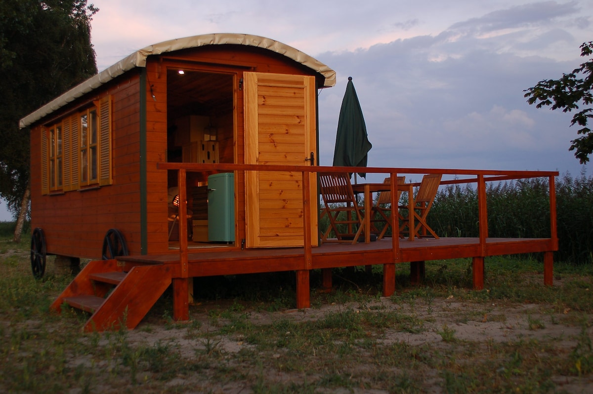 Roulotte tzigane confortable en bord de mer + lac Resko