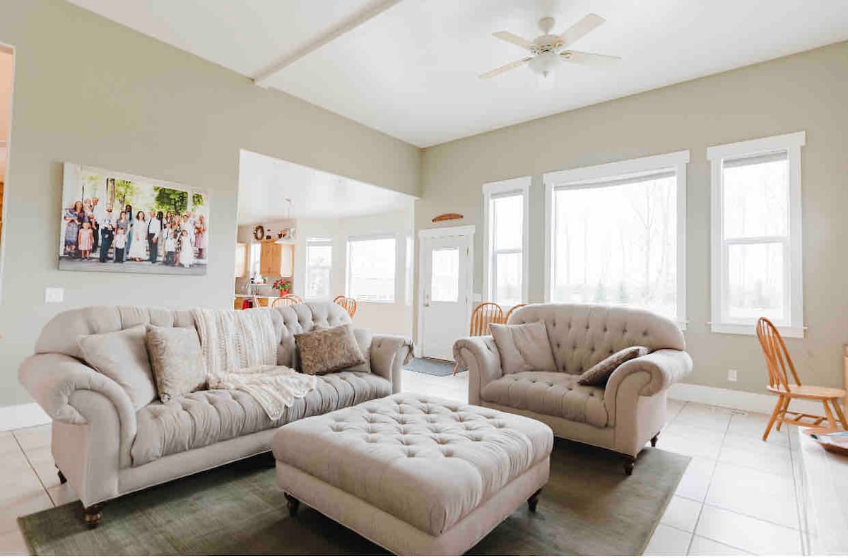 Cette maison rénovée de 2 000 pieds carrés dispose de 3 chambres avec lit Queen Size, ainsi que d'un canapé-lit Queen Size au niveau principal. Tous les lits sont des matelas en mousse de gel de 10 pouces pour un confort extrême. 2 grands salons ont beaucoup de sièges confortables et 2 grandes téléviseurs intelligents. La cuisine dispose de tout ce dont vous pourriez avoir besoin pour cuisiner et préparer des repas pour votre séjour. Vaisselle, poêles, bouilloire, cafetière, grille-pain, plaque chauffante, mijoteuse, plats de cuisson/de service, etc. NOUVEAU PickleBall à l'arrière !
