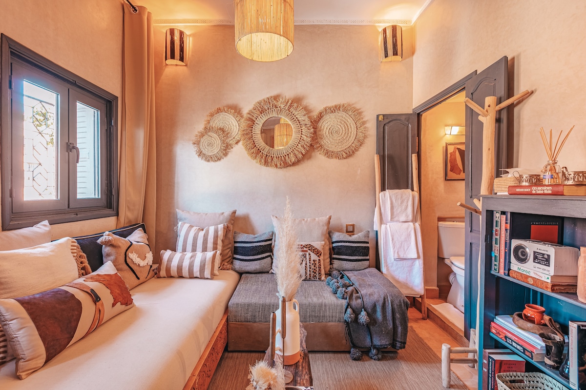 Bienvenue dans notre Riad récemment rénové au coeur de Marrakech : Dar Nurah Le Riad est à louer dans son intégralité, aucun autre invité ne partagera avec vous. Que vous soyez un couple, une famille ou un groupe d'amis, Dar Nurah sera le refuge parfait pour vos vacances à Marrakech. Un total d'environ 180m² à louer en exclusivité avec 2 chambres en suite joliment décorées, un salon avec un canapé convertible en lit supplémentaire et de nombreux espaces de vie ouverts.
