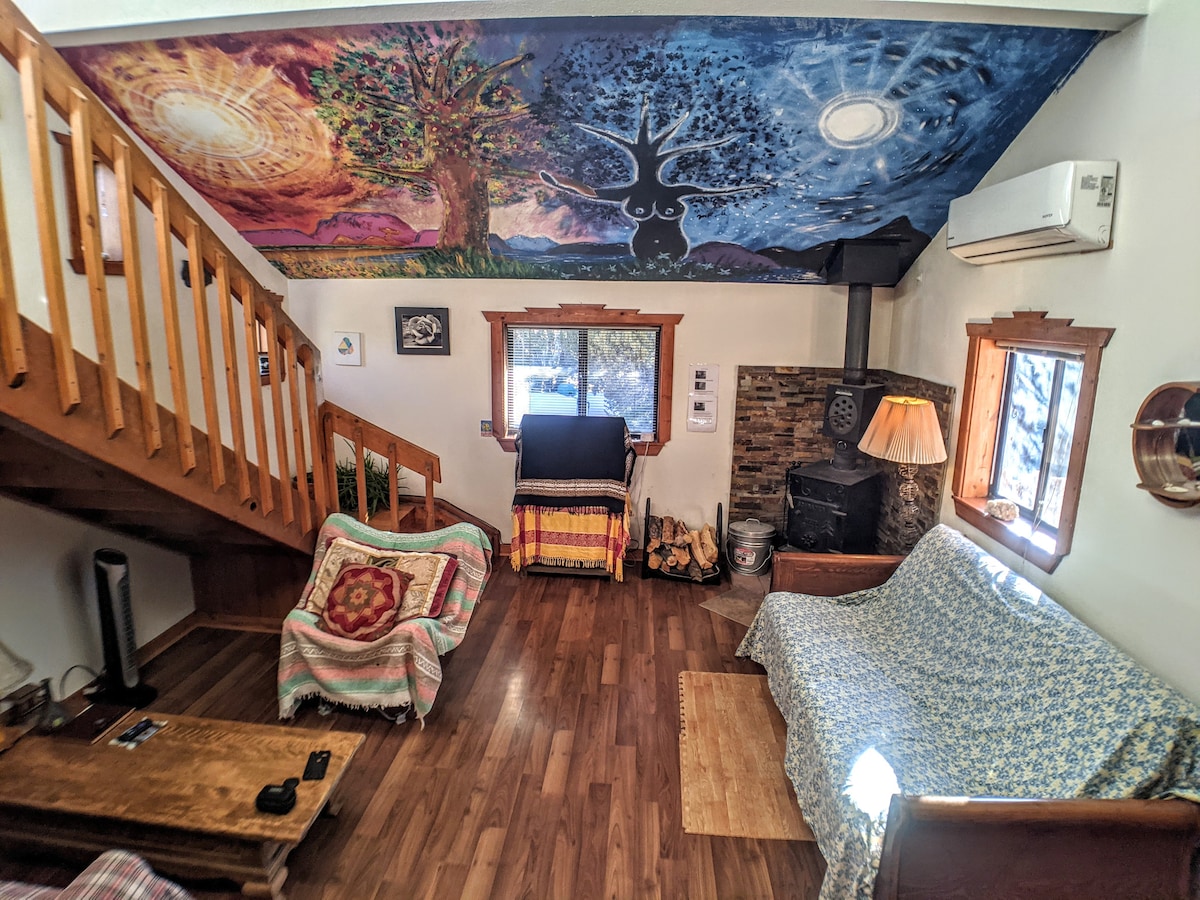 Une cabane artistique magnifiquement aménagée avec toutes les commodités sur une crête de la vallée sauvage de Pecos. Vue imprenable sur les montagnes, la nature sauvage, la mesa de Rowe et la Voie lactée. Le trajet jusqu'à Santa Fe est facile et paisible (environ 35 minutes). Le trou de baignade de la rivière Pecos est accessible par un sentier depuis la maison ainsi que plusieurs kilomètres de randonnée dans la nature sauvage. Internet est fiable, haut débit et large bande. Il y a un lave-linge/sèche-linge dans le logement.